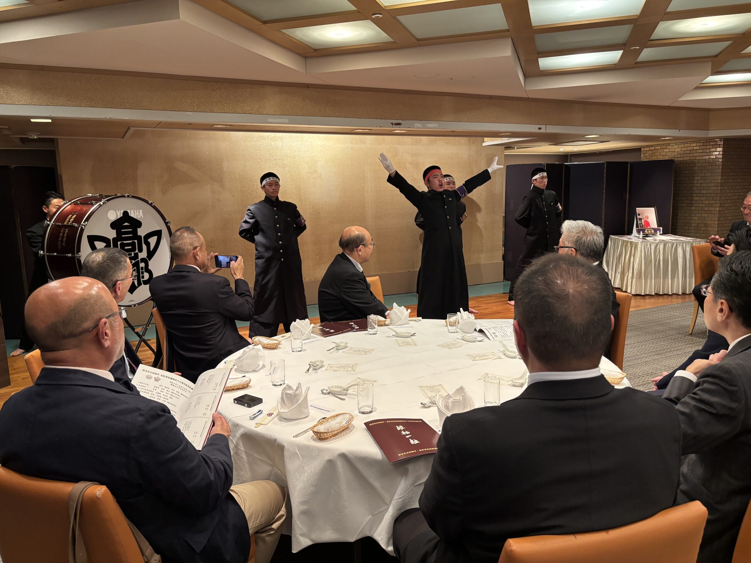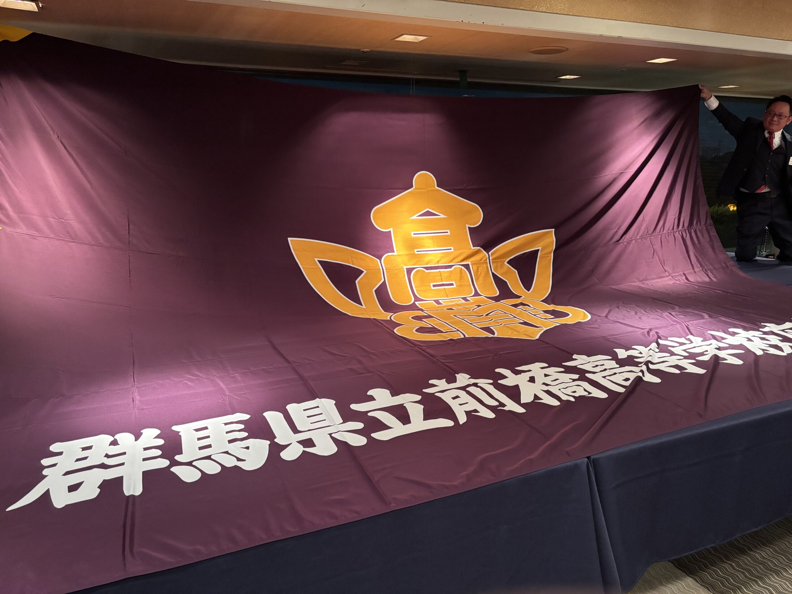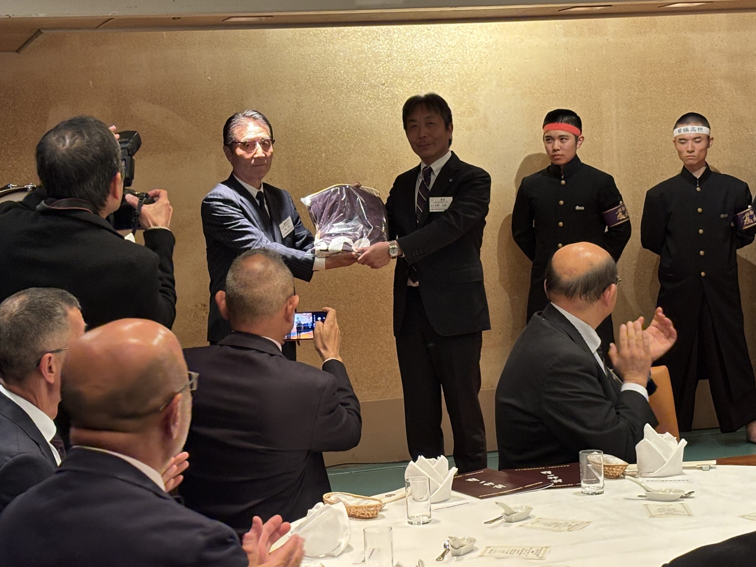 令和7年10月25日、群馬ロイヤルホテルにて「群馬県立前橋中・高等学校応援團結成90周年記念式典」が、40名近い参加者が集まり、開催されました。学校からは天野校長(昭和59卒)、同窓会からは反町会長(昭和48卒)と鈴木書記(平成6卒)が出席。ご来賓として硬式野球部OB会、太田高校・桐生高校・高崎高校それぞれの応援團OB会の方々も参加されました。